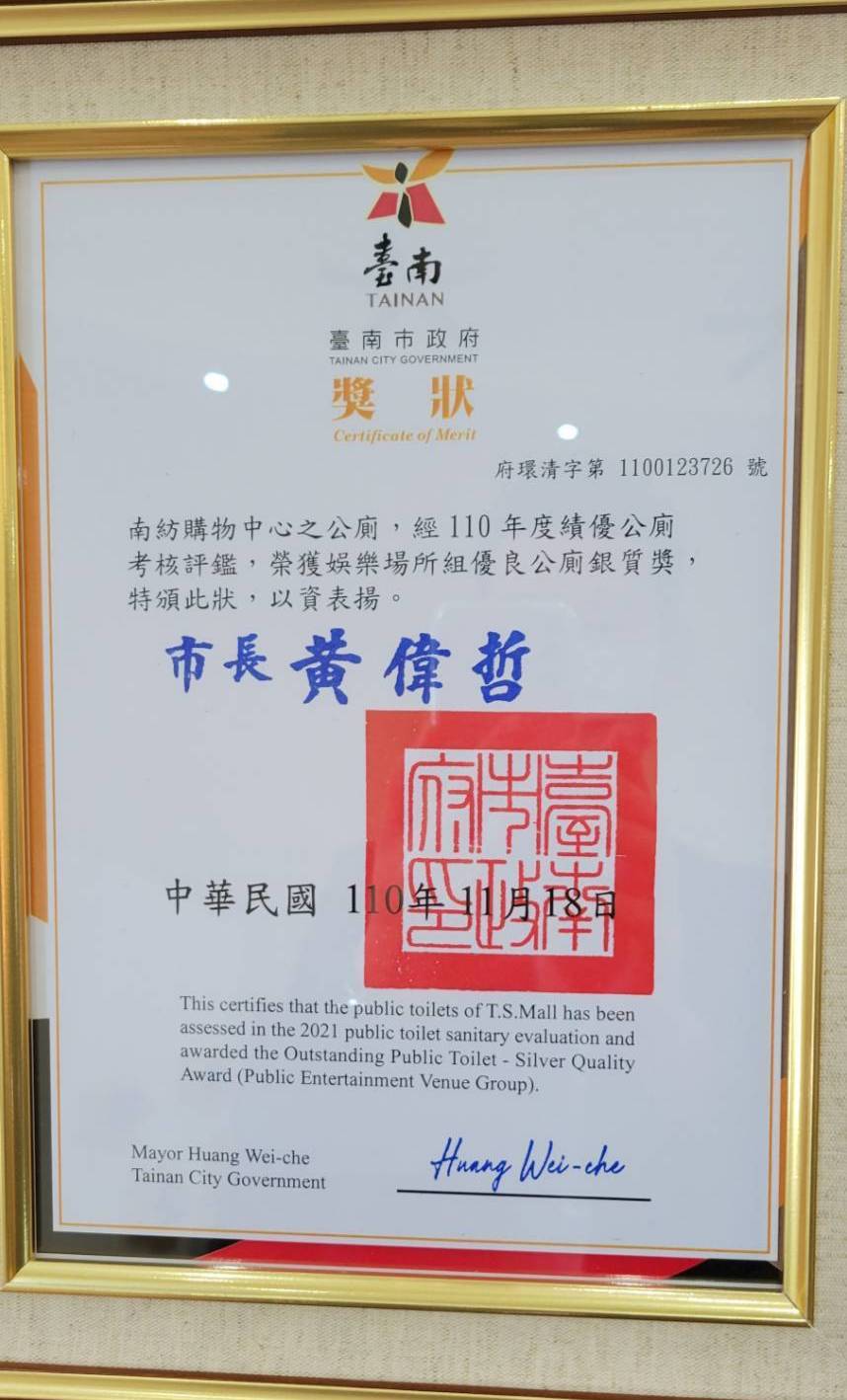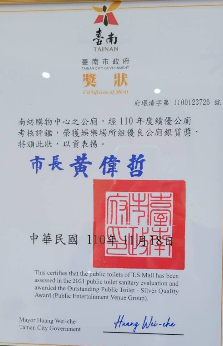 110年台南市績優公廁表揚 賀!新高企業承接案場「南紡購物中心」於2021年11月18日獲頒台南市績優公廁銀質獎! 台南市環保局表示,獲獎的公廁各個乾淨、整潔、明亮、不臭、不髒,乾淨程度、外觀甚至可與百貨公司及五星級飯媲美,在上述評選條件下能脫穎而出實屬不易。感謝清潔同仁克盡職責,提供使用者舒適的如廁空間。 新聞連結 : 110年台南市績優公廁表揚
