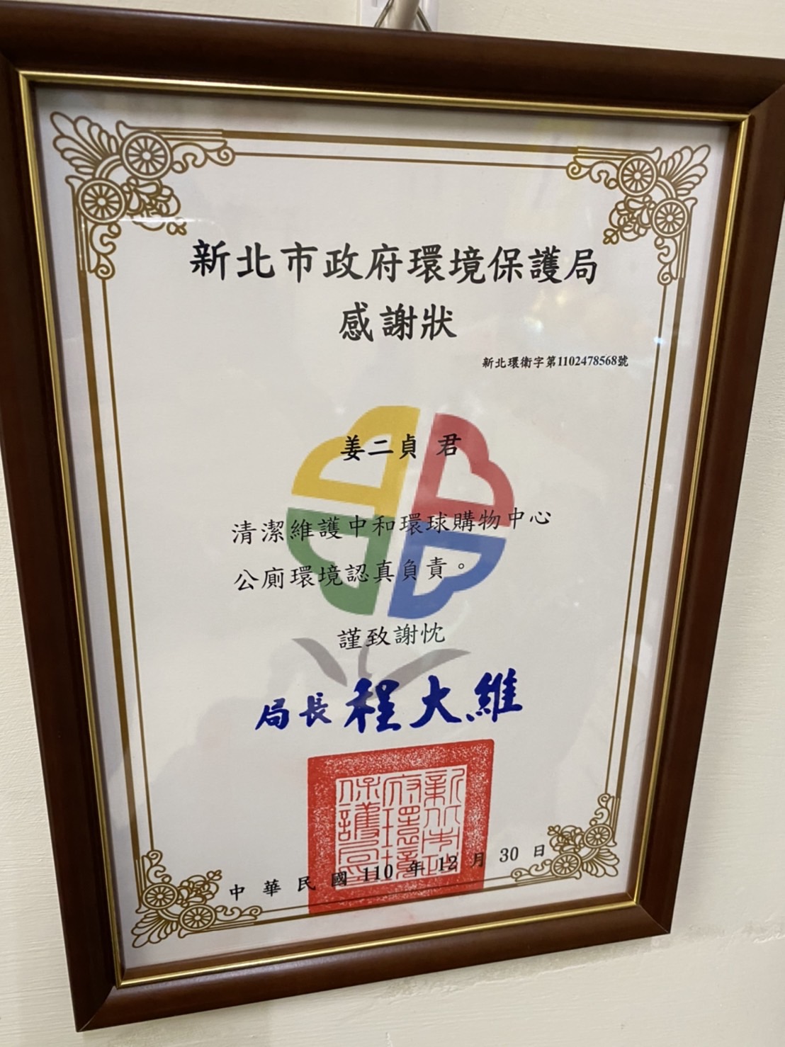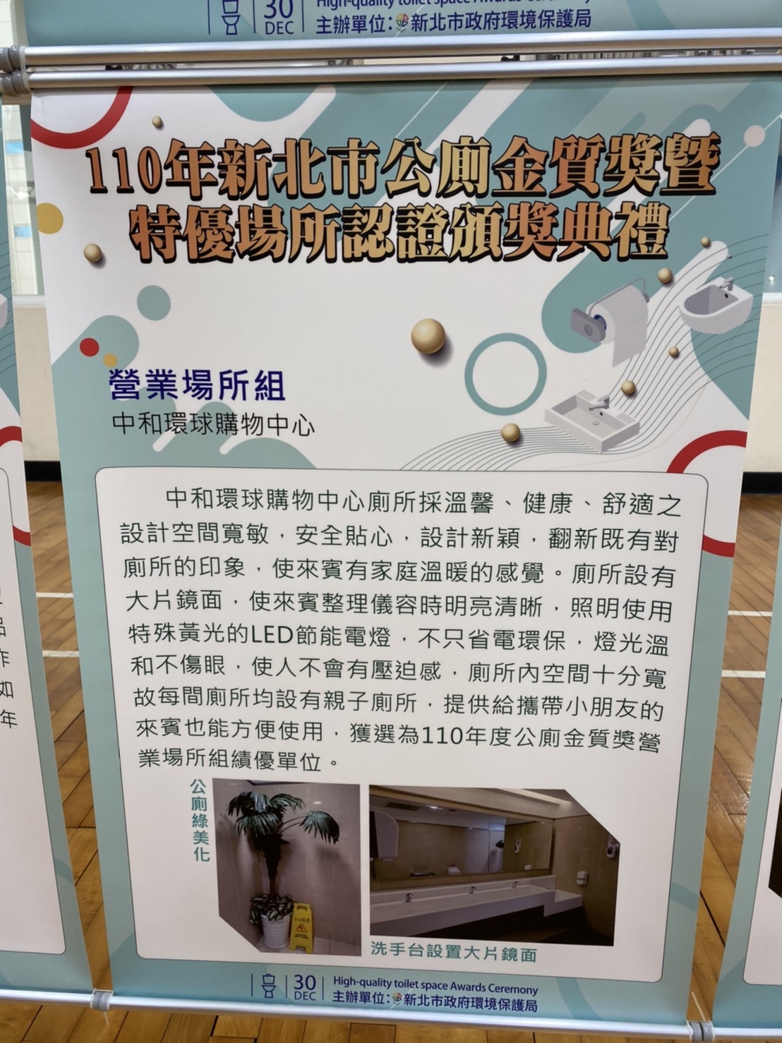 新北市公廁金質獎-中和環球購物中心 新北市環保局舉辦「110年度公廁金質獎暨特優場所認證與金質清潔人員」頒獎典禮,本公司承接案場「中和環球購物中心」榮獲營業場所組「金質獎」!姜二貞組長更獲頒「金質清潔人員獎」,工作表現深得肯定,新高引以為傲! 中和環球購物中心每逢假日來客眾多,且多為攜家帶眷前來,現場清潔維護配合提高打掃頻率並加強內部巡檢,以提供整潔安全的環境.讓家長安心,小朋友開心! 新聞連結 : 新北市公廁金質獎