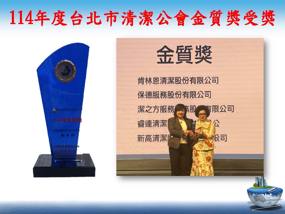 新高集團獲頒114年度台北市清潔服務商業同業公會[ 金質獎 ] 本公司長期秉持提升清潔服務品質,確保公共空間與工作環境全方位整潔,為社會大眾提供更舒適、 安全及衛生的生活為目標而努力。 於114年4月24日獲頒台北市清潔服務商業同業公會 [ 金質獎 ]殊榮
