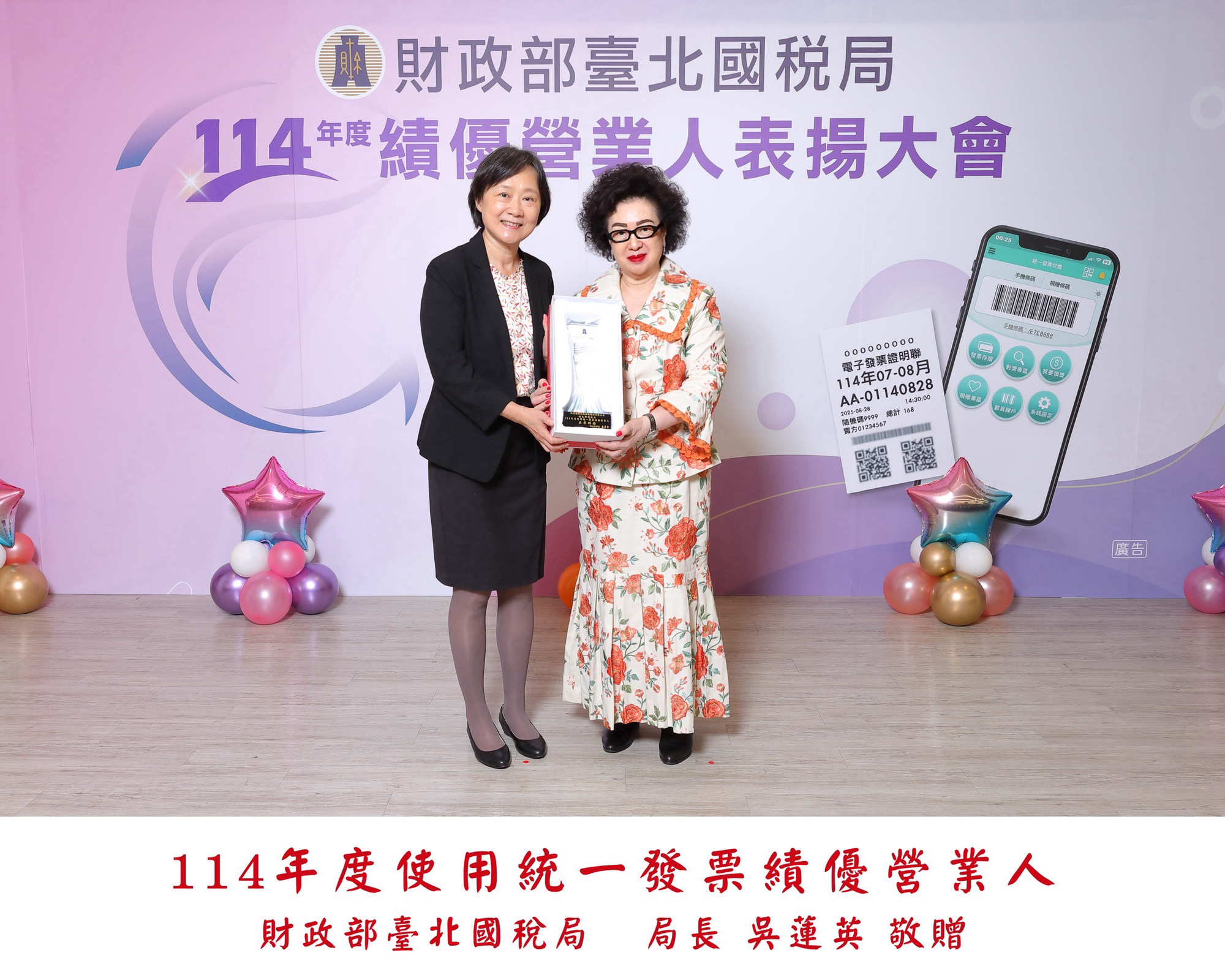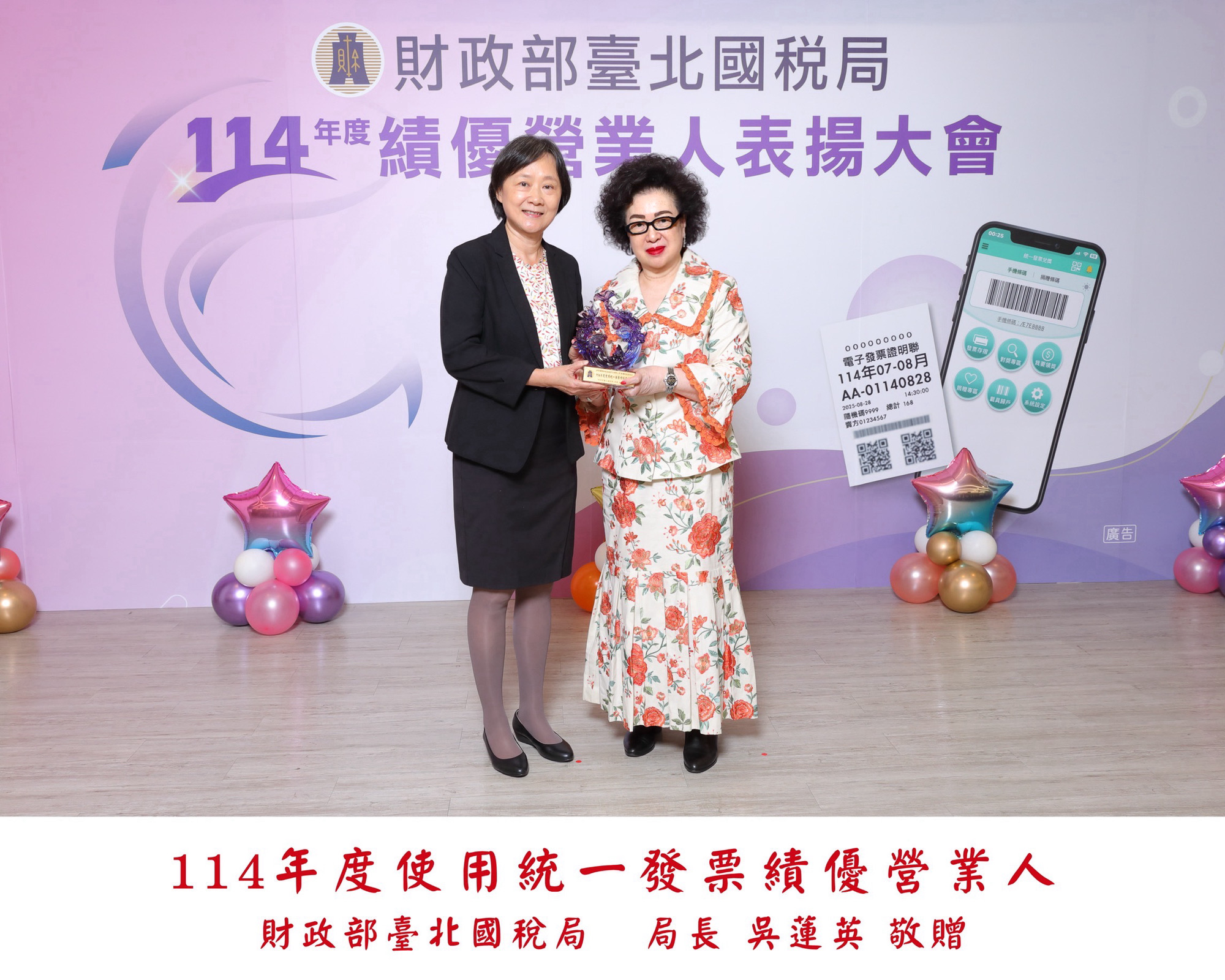 財政部臺北國稅局表示,為獎勵營業人誠實使用統一發票及電子發票,落實政府節能減碳政策及結合企業永續經營理念,該局 114 年度評選出轄內使用統一發票績優營業人 45 家及使用電子發票績優營業人 24 家,於 9 月 18 日舉辦績優營業人頒獎表揚典禮,由吳局長蓮英代表財政部頒發獎座及致贈紀念品。